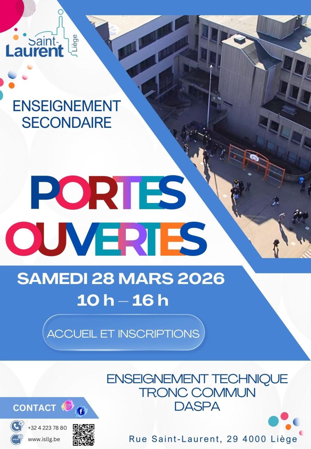 Institut Saint-Laurent – LiègeNous avons le plaisir de vous inviter à notre journée Portes Ouvertes le samedi 28 mars 2026 de 10h à 16h.Venez découvrir :